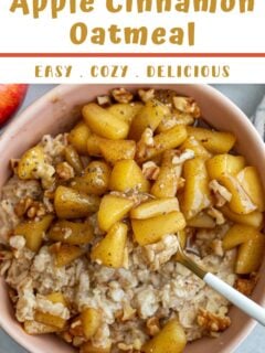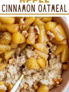 Delicious Apple Cinnamon Oatmeal is filled with cozy spices and topped with caramelized bites of tender apples. This easy apple oatmeal is naturally sweetened and makes the perfect breakfast for transitioning from summer to fall! Add nuts for the ultimate treat!