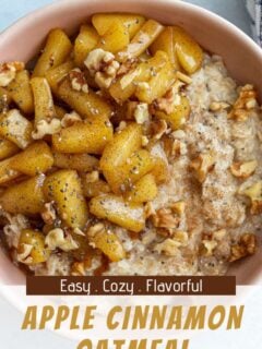 Oatmeal is my go-to breakfast most days, but especially in the fall and winter when the mornings are cool and crisp. This recipe includes a basic bowl of oatmeal that is taken to the next level when sautéed cinnamon apples are added as a topping. This dish is loaded with all the flavors you start craving in autumn, like fresh apples, warm spices and brown sugar. So good!