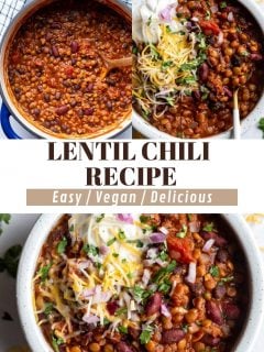 Looking for a super tasty, crowd-pleasing dinner option? Lentil Chili with incredible bold flavors coming right up! This lentil chili recipe is a hearty and healthy plant-based chili filled with lentils, beans, tomatoes, and plenty of delicious spices! An easy one pot dinner option that the whole family will love!