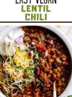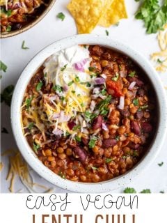 Don’t forget the toppings! I love serving this easy lentil chili with tortilla chips, shredded cheese, diced red onion, cilantro and a dollop of dairy-free sour cream or greek yogurt. Feel free to use any favorite toppings that you’re craving.