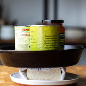 Step 3: Place a cast iron skillet (similarly heavy pan) on top of the tofu, balancing it so that it stays on top. Weigh the skillet down with a few heavy cans or other similarly weighted objects.