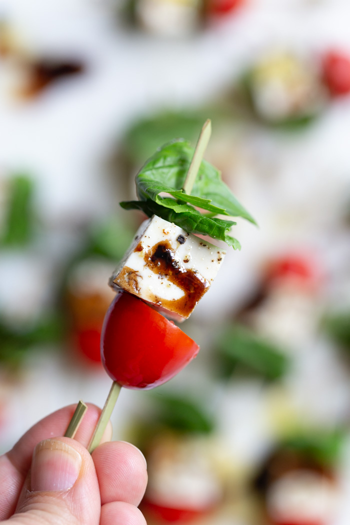 Easy and delicious Caprese skewers made with tofu and a nice drizzle of balsamic glaze!
