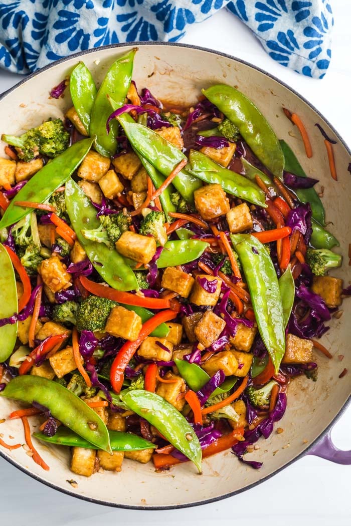 This Veggie & Tofu Stir Fry is an easy vegan dinner that’s quick, healthy, and SO DELICIOUS! Great for weeknight dinners and the crispy tofu is amazing!