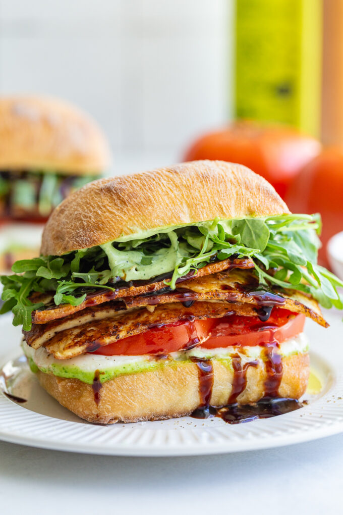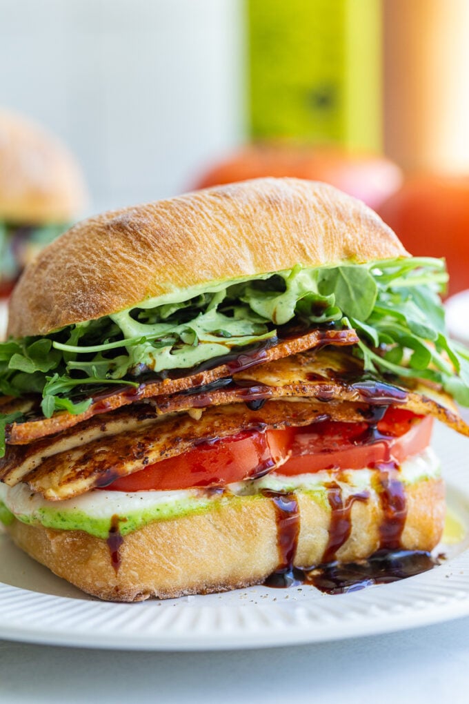 - On top of the cheese, place the tomato and sprinkle with a bit of salt and pepper. Top with the cooked tofu and a generous drizzle of olive oil and balsamic glaze. Finally, add on some arugula and the top of the ciabatta roll. Enjoy immediately!