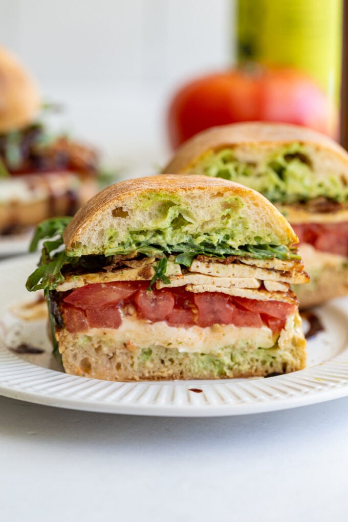 These Tofu Caprese Sandwiches are simple to make and the perfect handheld meal for summer! The basil sauce gives SO MUCH flavor to the sandwich and the tofu is crispy and adds a nice bit of protein to the meal!