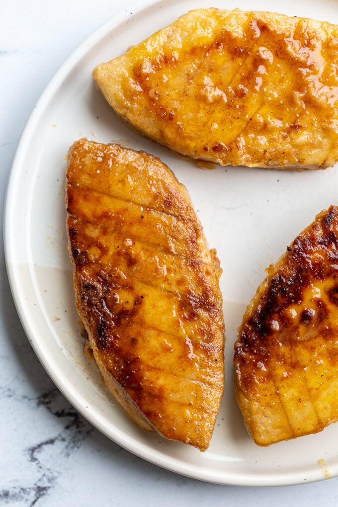- Start by prepping the tofu by cutting it into 3 even pieces longways (see video for reference). If you’d like to cut it into chicken like pieces then lay each piece flat and cut off the top right and bottom left corners so that they’re rounded and roughly resemble a piece of chicken breast. Again, you can watch my video for reference. I like to trim off tiny bits of the rough edges to round the edges. Slice diagonal cuts going about ¼ of an inch deep on both sides.