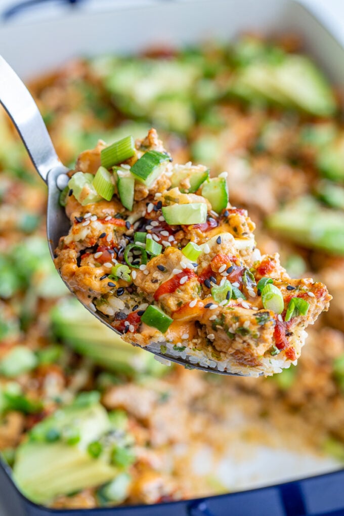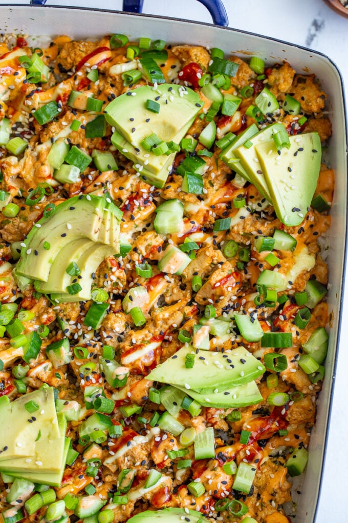- Bake for 15 minutes. Remove from the oven and top with green onions, cucumber, and avocado plus a good drizzle more of mayo, sriracha, and sushi sauce. Sprinkle with sesame seeds and ENJOY!