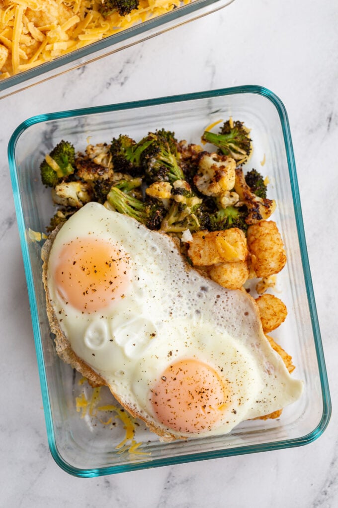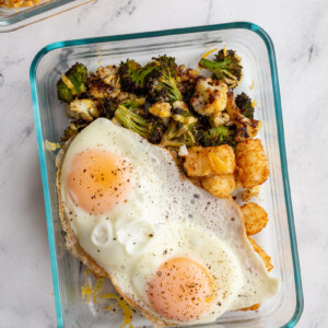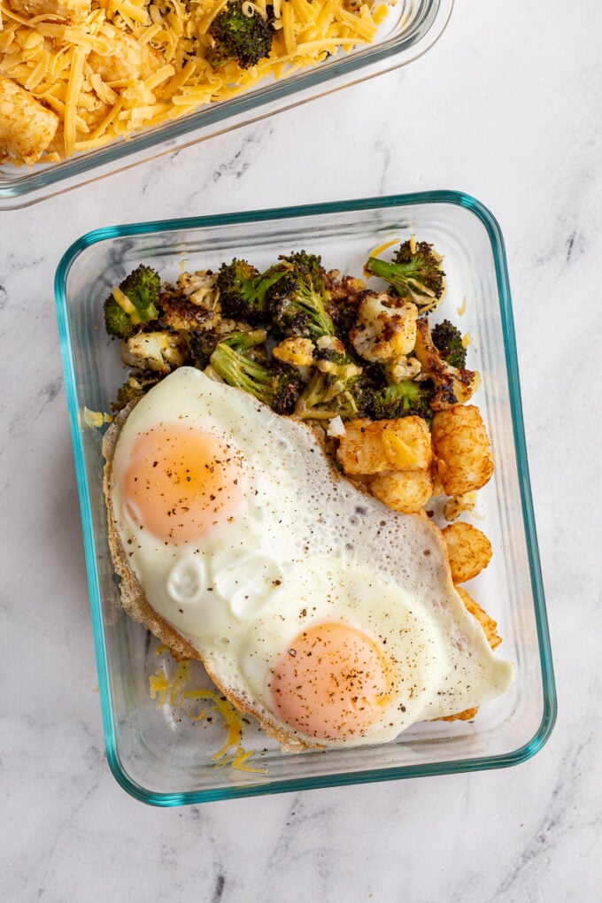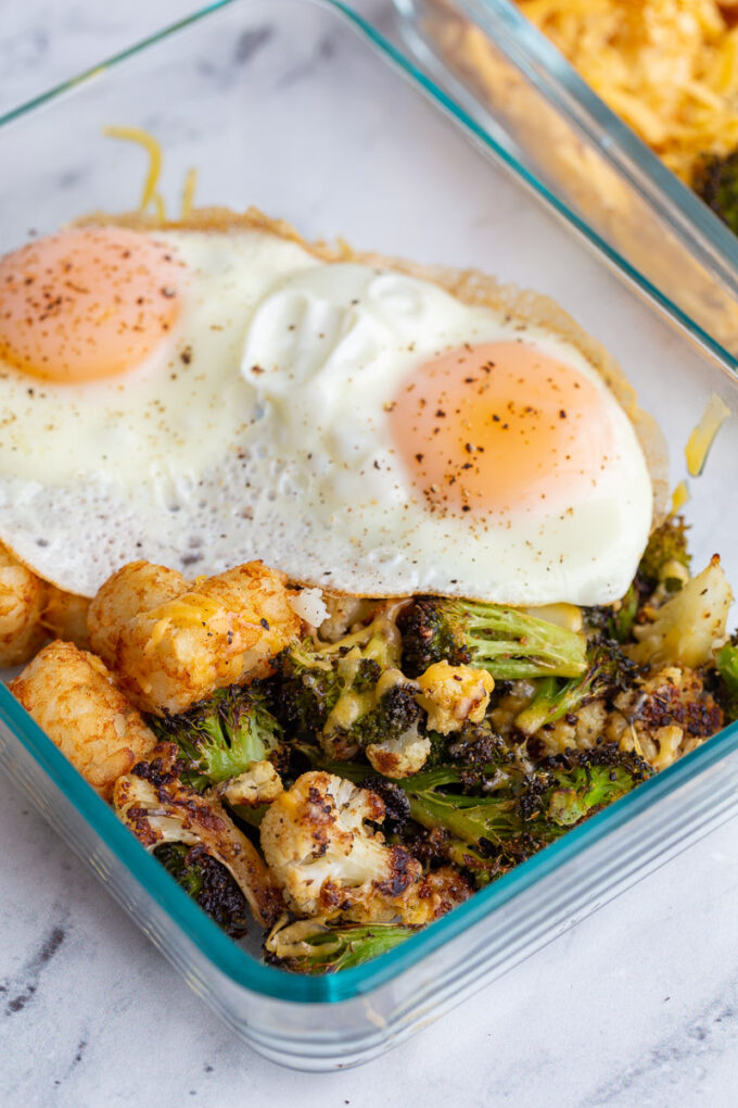 - Divide the veggies, tater tots, and cheese evenly among meal prep containers. Place in the fridge until ready to eat.