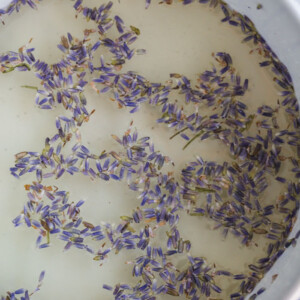 - Let cool slightly and then strain the mixture through a sieve to remove the lavender. Pour into an airtight container for storage.