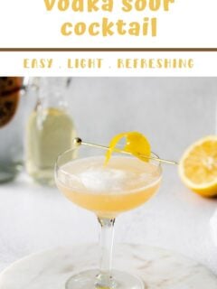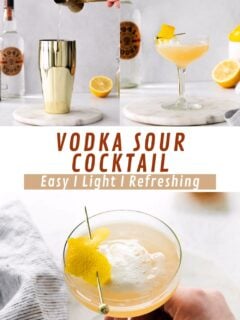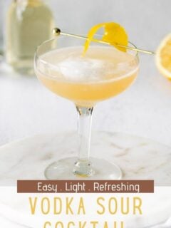 A Vodka Sour is a classic vodka cocktail that’s light and refreshing with the perfect balance of sweet and tart. This cocktail recipe is easy to make with a mix of vodka, fresh lemon juice, simple syrup and a frothy egg white. Garnish with a twist of lemon peel and you have the perfect drink for happy hour!
