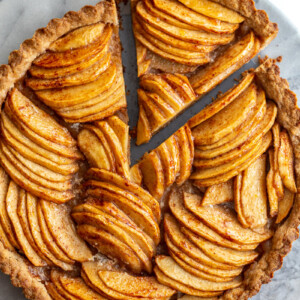 I had originally planned to make a really pretty design with the apples like I’ve seen on some other apple tarts. HOWEVER, that felt like it was going to be SO much work and I really wanted this tart to feel simple and approachable. So, we’ve found a good middle ground that’s EASY but still really pretty and a definite show stopper.