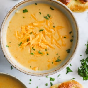 I’ve also served this soup as a beer cheese dip for chips and pretzels before and it’s DELICIOUS! If you’re going to do this, I suggest adding in about HALF of the broth so that it turns out thicker.