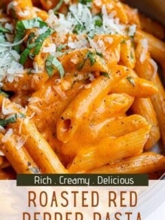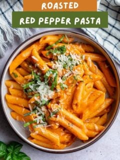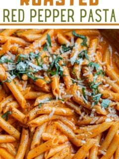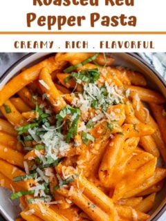 Roasted red pepper pasta is perfect for a quick weeknight dinner when you want a bowl of comfort food! The sauce is creamy, smoky-sweet, rich and SO delicious. It tastes like something from your favorite Italian restaurant, yet it takes very little effort to make at home. As an added win, this recipe only takes 20 minutes from start to finish! It will definitely become one of your go-to dinners!