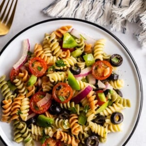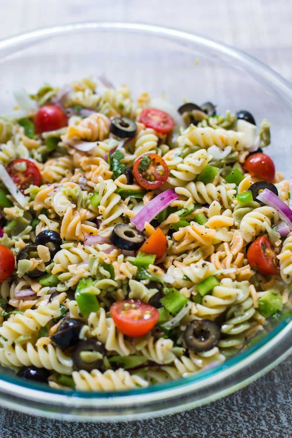 Growing up, I ate a LOT of pasta salad (zero complaints!). This pasta salad is my attempt to replicate my moms pasta salad which is a highly requested dish at ALL family functions.