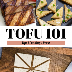 I go into detail in my video (see above) on how to press tofu both with a tofu press and using random objects you have lying around your kitchen. I use THIS tofu press. I also have a FULL COMPREHENSIVE post all about how and why to press your tofu. Check that out HERE.